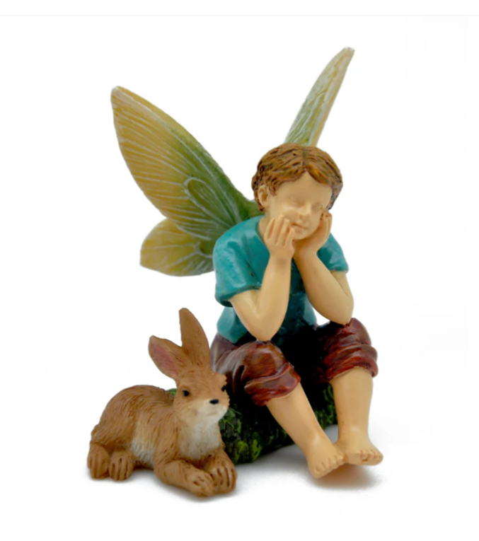 This fairy boy sits quietly with his brown bunny friend. His elbows are propped on his knees and his face rests in his hands.
