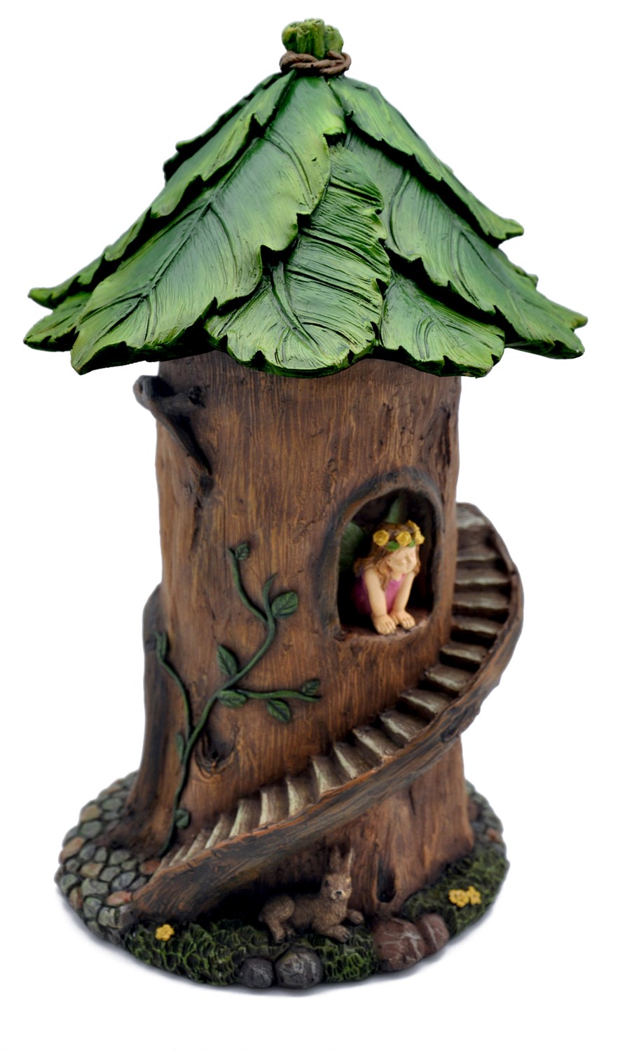The Country House is fashioned from an old log, complete with a leaf roof, stairway, and fairy peeking out the window.